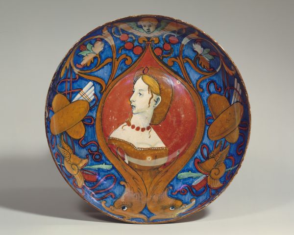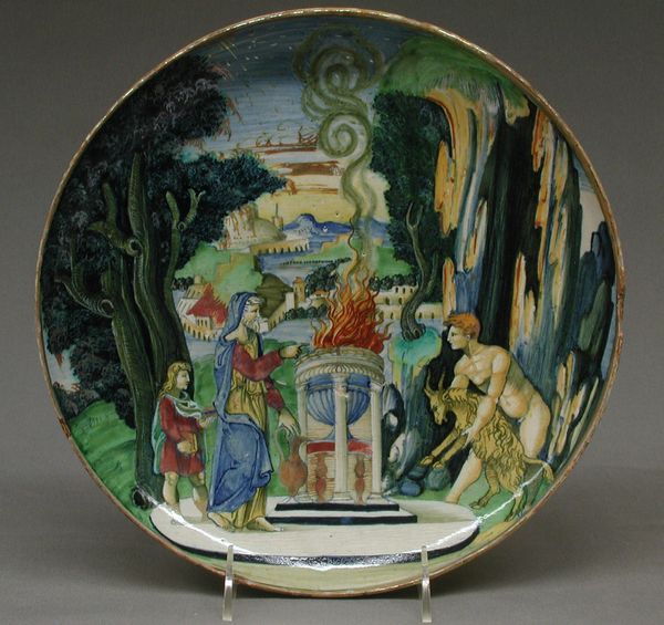 This is an earthenware dish depicting Saint Margaret, made by Maestro Giorgio Andreoli in the early 16th century. Here, Saint Margaret emerges triumphant, having conquered the dragon—a symbol of overcoming evil and temptation. Note the spear she wields, a common attribute signifying her victory, and the dragon itself, subdued at her feet, its form a twisted echo of ancient serpentine deities. This motif of a saint overcoming a monstrous beast can be traced back to early Christian art, echoing tales of heroes battling chaos. Consider how this imagery taps into our collective memory, stirring deep-seated fears and aspirations. The dragon, a primal symbol of the subconscious, becomes a vessel for societal anxieties, while Saint Margaret embodies the hope for redemption. This symbolic drama, repeatedly staged throughout art history, reveals a powerful emotional undercurrent, engaging viewers on a visceral level. The cyclical nature of this imagery, constantly re-emerging and adapting, underscores how symbols evolve, carrying echoes of past meanings while resonating with contemporary concerns.