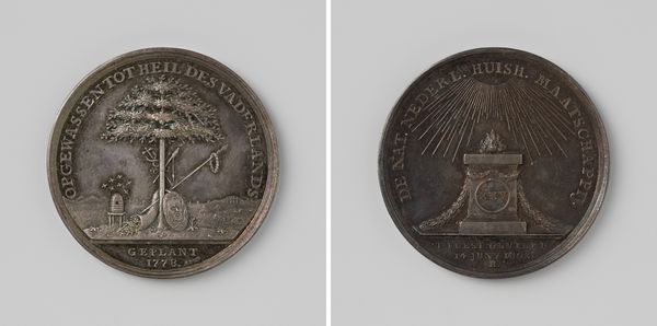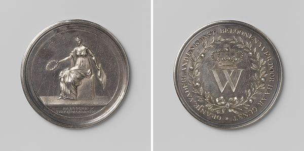 Curator: Alright, let's dive into this work. Editor: This is "Battles of Quatre-Bras and Waterloo in honor of the Duke of Wellington and Blucher," a metal relief engraving from 1815. It’s quite small and austere, depicting these two figures facing one another, with text surrounding them. I’m immediately drawn to the almost stoic formality. How do you interpret this piece? Curator: I see this as more than just a commemorative medal; it's a potent piece of propaganda embedded in a specific historical and social context. Consider the period: Europe is attempting to rebuild after the Napoleonic Wars. This piece hails Wellington and Blucher as saviors, these partnerships between nations were complex and built on power dynamics that are not always represented. How does celebrating these leaders and this victory influence perceptions of power, particularly for marginalized communities? Editor: That's a compelling point. I hadn't considered the role of propaganda so directly. Are there particular elements of the composition that support that reading? Curator: Absolutely. The visual language here borrows heavily from Neoclassicism, which, at the time, was associated with notions of order, reason, and imperial power. By presenting Wellington and Blucher in this style, the artwork reinforces a specific narrative about their leadership and the supposed "triumph" of their cause. Who were the victims erased from this narrative? What perspectives are silenced? The glorification of these historical figures must be counterbalanced by remembering those that were underrepresented. Editor: That’s very insightful. Thinking about whose stories are *not* told definitely gives a whole new dimension to the work. Curator: Exactly. Art, even something as seemingly straightforward as a commemorative medal, operates within complex historical power dynamics and societal relations, and that must always be central to the narrative we bring forward. Editor: This really does give me a new appreciation for the cultural contexts and social narrative present in art! Curator: And for me, seeing your response as a modern viewer reinforces how these historical works continue to engage with and shape our contemporary understanding of power.
