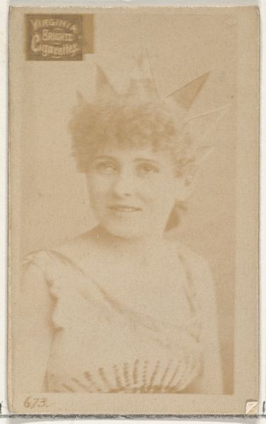This small card was one of a series of cigarette cards produced by Allen & Ginter in the late 19th century in the USA. These cards, distributed with Virginia Brights Cigarettes, reflect the period's fascination with celebrities, particularly actors and actresses. Here, we see a portrait of an actress, likely a popular figure of the time. The image creates meaning through its visual codes: the actress's attire, hairstyle, and even the crown-like headpiece suggest a certain status and glamour associated with the stage. This image participates in the construction of celebrity culture during the Gilded Age, when consumerism and mass media were on the rise. Such cards promoted not only the product—cigarettes—but also a lifestyle of aspiration and entertainment. Understanding this image requires us to investigate the social history of celebrity, the culture of advertising, and the growing consumer market of the late 1800s. Research into theatrical archives, advertising history, and period newspapers might reveal more about the actress featured and her role in shaping public tastes. This artwork reminds us that even the most seemingly trivial images can offer insights into the social conditions that shaped their production.