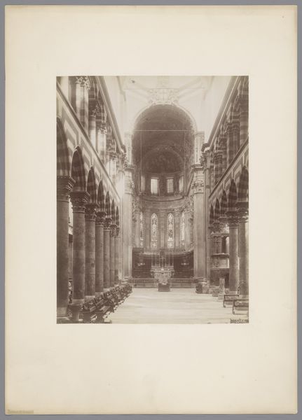Editor: This print, "Gezicht op de galerij van de San Giacomo Maggiore te Bologna, Italië" from approximately 1870-1875, shows the arcade of San Giacomo Maggiore in Bologna. The receding lines of the columns create such a powerful sense of depth. What do you make of how space is handled in this composition? Curator: The composition compels one to contemplate the formal elements. Consider how the photographer utilizes the parallel lines of the arcade, not merely as documentation, but as a structured arrangement. The arches provide a repetitive motif, almost rhythmic, directing the eye. Notice too the tonality; the contrast, subtle yet deliberate, which emphasizes depth. Do you find that the quality of light influences how you perceive its structural organization? Editor: I do. The light and shadow emphasize the architectural forms, but also create a sense of mystery, drawing you into the depths of the arcade. How would you consider the textures represented in the photo? Curator: Precisely. The textures introduce an essential dynamic. Observe the rough surfaces of the walls, contrasting with the smooth columns. This interplay of textures enhances the tangible quality of the space. Moreover, the aging of the photographic print itself introduces another layer, adding a temporal dimension to the composition's surface. Do you agree that this duality impacts the formal understanding of the work? Editor: I think so, yes! Considering the tonality and texture adds new depth to interpreting the receding space in the photograph. Thank you. Curator: Indeed. By examining the relationships of these formal elements, our understanding moves beyond mere representation toward a deeper comprehension of the artwork's structural integrity.