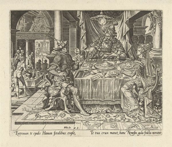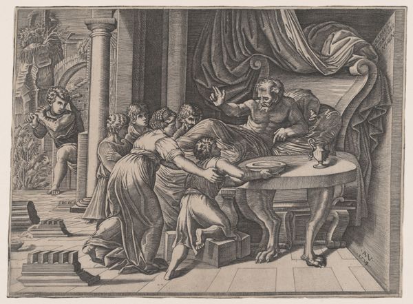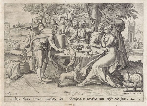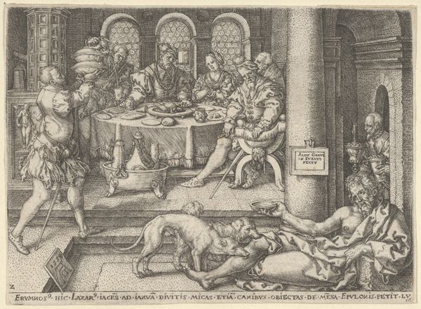 Curator: This is "Plague of Frogs" by Johann Sadeler I, created around the late 16th century. The etching captures a scene of biblical proportions, quite literally. Editor: It's wonderfully chaotic, isn't it? A bit unsettling, but the sheer density of detail draws you in. You can almost feel the panic. Curator: The engraving process allowed for such intricate detail, highlighting the material reality of the plague's impact on daily life, from the royal table to the common streets. Consider the social disruption! Editor: Precisely! The frogs aren't just frogs; they're a symbol of disruption. I love how the artist captures the absurdity of it all. It's a bit humorous, really. The elite’s horror is quite delicious. Curator: Sadeler's choice of printmaking also makes this subject accessible. It's not just for the wealthy. Editor: Exactly! It's a democratization of terror, a shared experience vividly rendered. Curator: A potent reminder of how art can reflect both social upheaval and the means of its own production. Editor: A rather ribbiting reflection, indeed! I will be here all week folks...