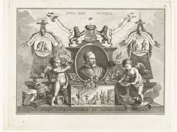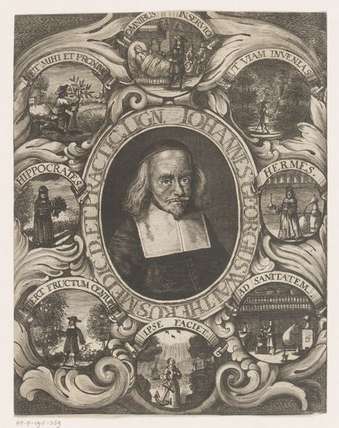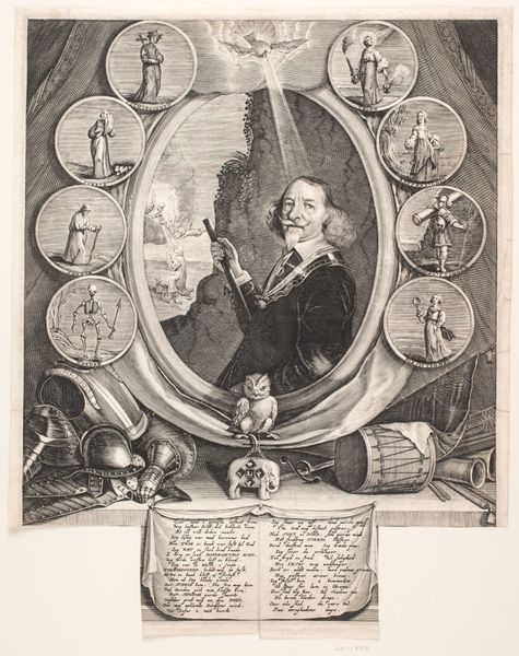 Editor: Here we have "Wentzel Rothkirch. Illustration til ligprædiken," an engraving and etching made in 1657 by Albert Haelwegh. The portrait is surrounded by smaller circular images, and there's so much symbolism packed in...it feels almost overwhelming. What's your take? Curator: Overwhelming is a good word for it. Consider that such elaborate memorial prints were often commissioned by or for the family of the deceased, meant to publicly commemorate their virtues and status. It's an intensely social act. What stands out to you beyond the general symbolism? Editor: Well, the central portrait has this imposing figure looking directly at us, holding what seems to be a commander's baton. And there are all sorts of objects below him. Are those his personal effects? Curator: Perhaps. We see an owl, an elephant figurine, some military gear…likely all alluding to aspects of his life, roles, and perhaps even aspirations. But remember, the print functions as public art. How would these images communicate specific messages about Rothkirch to his intended audience? Editor: So, the military gear suggests his role in the army. The owl probably refers to wisdom. And what about those circular images surrounding the portrait? Curator: They could represent different stages of life or perhaps allegorical figures associated with virtue or mortality. Death was very public during this era; how could prints like this shape collective memory and social standing? Editor: I see. It's not just a personal memento, but also a carefully constructed statement aimed at shaping public perception. This really makes me think differently about portraits! Curator: Exactly. Art isn’t created in a vacuum; it’s always intertwined with social, cultural, and even political currents.