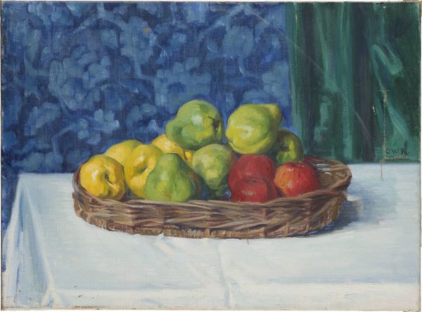 Curator: Here we have Gustave Caillebotte's "Fruit Displayed on a Stand," painted around 1881. It’s a captivating still life rendered in oil. Editor: It immediately strikes me as vibrant and abundant, like a cornucopia bursting forth! All those mounds of fruit set against crisp white paper are almost dizzying. Curator: Caillebotte painted this during a time of profound change in Paris, when modernization reshaped daily life. Still life allowed artists to focus on intimate and readily available aspects of the era's consumer culture. Editor: I'm struck by how much cultural weight rests on fruit, particularly within visual art. The colours, shapes, even the arrangements evoke abundance, fertility and the transient nature of life itself. Notice how he doesn't offer an idealized display, some fruits seem almost to have bruises or marks. Curator: Absolutely. These details speak to the everyday realities of Parisian marketplaces. Caillebotte often explored scenes of commerce, subtly critiquing social issues within visually pleasing arrangements. Did the emergence of newly affluent social classes influence this still life, by suggesting ideas of display and commercialism? Editor: No doubt. I find the layering and geometry within this work interesting. The way he places various species in contrast one another provides symbolism with multiple potential readings, and reminds me of vanitas paintings. Curator: The fruit stand suggests order and prosperity but also reveals the ephemeral nature of wealth and beauty. These themes were part of a much broader cultural conversation as Paris transformed into a world capital. Editor: The colours! He focuses almost obsessively on reds, yellows and blues—the kind of spectrum that would likely resonate with a shopper! And those contrasts are essential when emphasizing these goods. It suggests a tension between the pleasures of eating, of partaking, with an inescapable moment where nature will overtake everything! Curator: In that sense, “Fruit Displayed on a Stand” does more than document a scene, but encapsulates tensions prevalent during that era. It's fascinating how an object laden with such familiar associations can yield unexpected stories when viewed through a wider lens. Editor: Exactly. Those humble fruits encapsulate an era! Seeing them interpreted with such thoughtfulness opens a space for fresh conversations!