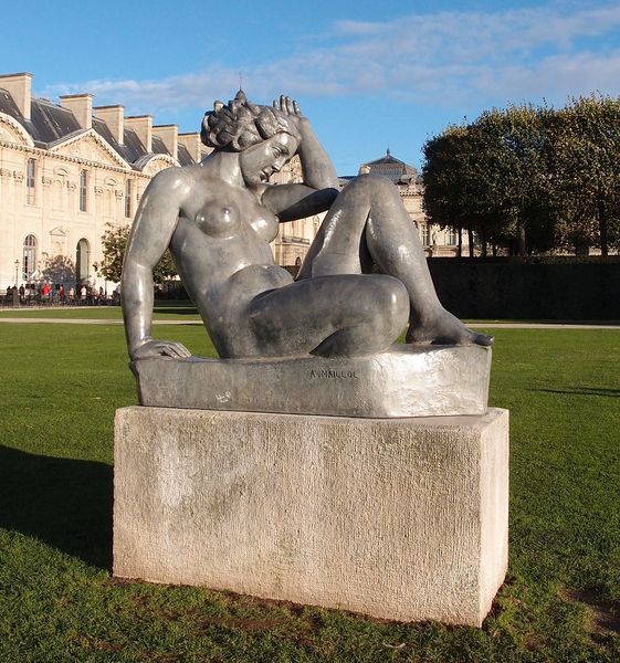 Curator: Aristide Maillol’s "Pomone," created in 1910, stands before us, a bronze sculpture installed here as a site-specific artwork. The sculpture’s placement within the park reflects ongoing dialogues about how public art interacts with, and is shaped by, its surrounding environment. Editor: There's something immediately grounding about this figure. The weight, the sheer presence of her body…it emanates a sense of rootedness and enduring strength, like an ancient earth mother. Curator: That sense of enduring strength could connect to Maillol's conscious return to classical forms. After a period dominated by more avant-garde styles, there was a desire amongst some artists to recapture the perceived stability and harmony of the classical world, echoing ideas that supported emergent nationalistic cultural agendas. Editor: Indeed, and Pomone herself – the Roman goddess of fruitfulness – offers a fascinating image. See how her cupped hands offer what could be fruit, or perhaps an invitation. Fruit, of course, connects to cycles of nature, and can signify knowledge. It really comes down to the viewer's interpretation. Curator: Precisely. Consider also the context in which Maillol was working. This was a period marked by rapid industrialization and social change. Artists often turned to idealized visions of the past. Was this a strategy to offer reassurance in a time of great uncertainty? The sculpture certainly gained considerable public approval in those pre-war years. Editor: The pose evokes earlier depictions of Venus, and the open gesture – a presentation of self – does carry both sensual and innocent implications. The scale definitely enhances her imposing, timeless quality. It makes me consider what Maillol intended the viewer to feel when standing before this powerful image. Curator: It seems the sculpture functioned as both a symbolic attempt to invoke harmony and stability during societal flux, and an active player in shaping public artistic tastes. Its continuing presence allows us to re-evaluate what visual elements and classical themes are used to express collective cultural values, and perhaps even personal yearning, at particular points in time. Editor: For me, this Pomone represents a link between ancient ideas and modern experience. It's the emotional weight and cultural echoes imbued in the art piece, from the symbolic implications of offering cupped hands to its rooted-seeming permanence, that deeply resonate.