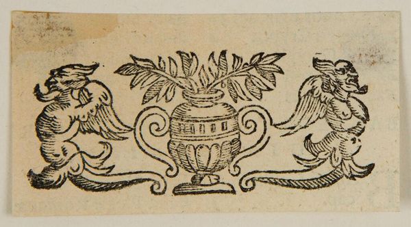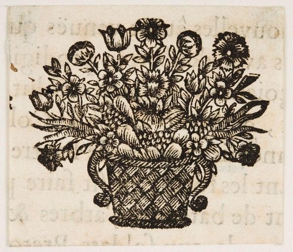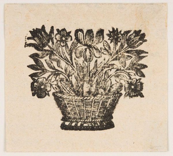 Curator: This is a woodcut print titled "Head- or Tail-piece," by an anonymous artist, housed here at the Harvard Art Museums. Editor: It's charming, a small, dense floral arrangement bursting from a woven basket. So simple, almost folksy. Curator: These ornaments typically marked the beginning or end of sections in books. Their production involved specialized labor, from wood preparation to carving and printing. Editor: I’m fascinated by the interplay between the supposed "high art" of the illustrated text, and the frankly functional "craft" of bookbinding. It's all part of the same commercial ecosystem. Curator: Absolutely. The prevalence of such imagery also reveals contemporary ideals about nature and domesticity, circulated to a broad reading public. Editor: And, considering this piece is anonymous, it also underlines how the vast majority of art production, even then, was collaborative and largely uncredited. It’s so telling. Curator: Indeed. Focusing on the social and material processes behind even seemingly minor works deepens our understanding of their cultural value. Editor: Precisely. It makes you consider the hands that shaped the artwork and the world that formed those hands.