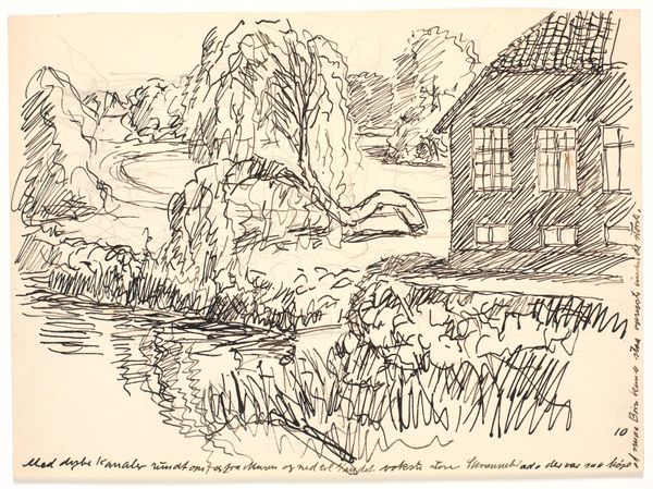Editor: So, here we have P.C. Skovgaard's "Thatched Farmhouse at Læsø," made in 1849 with pen, pencil, and ink. I’m struck by the intricacy of the lines, especially in the thatched roof – it almost feels like a portrait of the building itself. What do you make of this, looking at it from a historical perspective? Curator: It's fascinating how Skovgaard chose to depict this humble farmhouse. Think about the context: 1849 was a time of growing national romanticism across Europe, particularly in the wake of revolutionary fervor. The depiction of the rural landscape and its inhabitants became a symbol of national identity, of 'authentic' culture distinct from urban centers. Does that strike you as a politicized perspective? Editor: It does now that you mention it! It’s not just a cute drawing of a house. So, was Skovgaard intentionally participating in this nationalistic movement? Curator: It's likely. He wasn't just objectively recording what he saw, but also making choices about what to emphasize: the solidity of the peasant dwelling, the harmony of the house with nature, as visible with the trees enveloping the building on the left. Consider where this piece would be exhibited, the audience, the other works shown alongside it – all contribute to its meaning as a cultural artifact. Is this in keeping with what you would consider social realism at this time? Editor: I think so, although it seems almost… idealized. Not much indication of the hardships of farm life here. It’s romanticized social realism, perhaps? I’ve definitely learned to be more aware of the layers of cultural meaning behind seemingly simple landscapes! Curator: Exactly. The act of selecting this specific scene, of imbuing it with such detail through drawing, turns a simple dwelling into something representative, something symbolic of the Danish national character at that time. And remembering this, one hopes visitors can look beyond the lines to find what is implied within this evocative art.