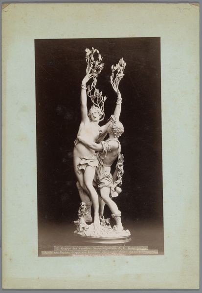 Editor: Here we have an old photograph – probably from between 1875 and 1900 – by Médéric Mieusement. It's a photo *of* a sculpture; specifically, it's of a plaster cast of a sculpture depicting three boys and a swan, which originated in Versailles. The monochrome tones give it an air of faded grandeur... Almost like a memory. What do *you* make of it? Curator: Ah, yes! This image whispers of fleeting beauty. The choice to photograph a plaster cast, itself a copy, introduces layers of removal, like echoes fading in time. Look at the poses—that sense of exuberant, almost clumsy playfulness. The children aren’t posed in some grand, heroic stance; there’s a delightful awkwardness, wouldn’t you say? Editor: Yes! It's like they're caught in a real moment, not just pretending. Curator: Exactly! It speaks to a longing for simpler pleasures, for an idealised past – maybe even the mythical Arcadia? Think about what *isn't* here: colour, the actual tactile experience of the stone itself. We’re left with shadows and light, inviting our own nostalgia. What feelings come up for *you* when you view it? Editor: Hmmm, the monochrome does make me feel nostalgic... It gives an 'aged' perspective. But in truth, the lack of information makes the statue seem universal - that is, the interaction between the three children and the swan remains timeless. Curator: Beautifully said. Universality emerges precisely through that deliberate stripping away of specificity. The picture asks more than it answers, wouldn't you say? Editor: Definitely. I came in thinking it was just a simple photo of a statue, but now it feels more like a poem about time and memory. Curator: Indeed. And isn't it wonderful how art can unfold like that, layer by layer, revealing itself anew with each encounter?