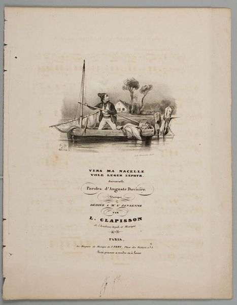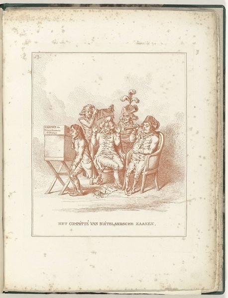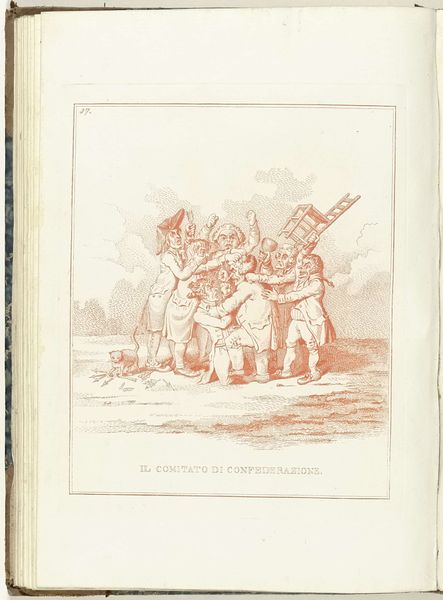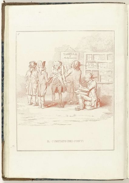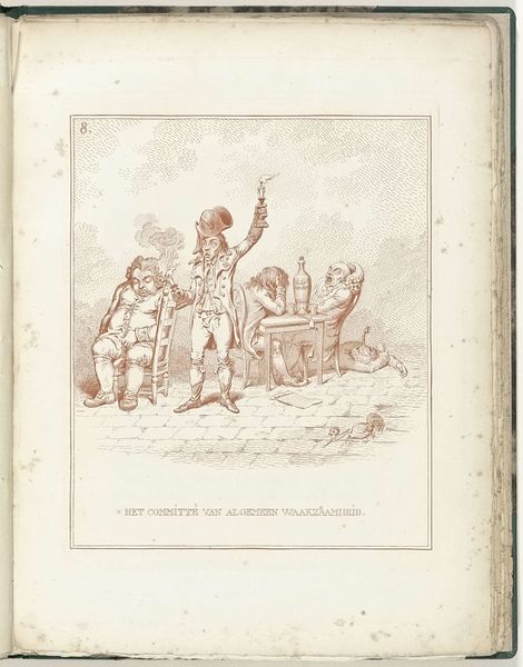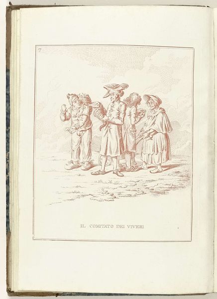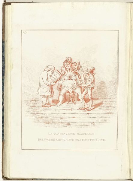 This engraving, "Comité van Koophandel en Zeevaart" from 1795, uses a limited palette of sanguine ink to create an open-air scene. The composition is horizontally structured with three figures dominating the foreground, set against a backdrop of sea and sky. The sparse use of line work and absence of color variation creates a flattened effect, typical of engravings, and evokes a sense of distance. The figures—a craftsman, merchant and seamstress—are placed on the shore, near a modest sailing ship. The organization of the scene can be seen as a visual encoding of economic structures, reflecting the mercantilist ideology of the period. The figures and boat signify the interconnected roles of production, trade, and maritime transport, while the linear style of the engraving suggests a rational, ordered view of economic activity. The lack of shading reduces the characters to graphic signs which encourages us to consider the image as a structured system of signs that reflect broader cultural and economic concepts. The artwork functions as a coded representation, inviting interpretation of its visual components through the lens of economic theory.