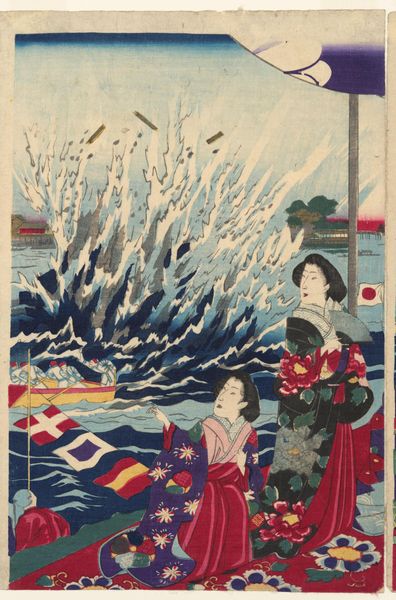Editor: So, this is a woodblock print called "Port Festival Scene" by Yoshu Chikanobu. It's brimming with boats and flags—utterly joyous! What catches your eye when you look at this? Curator: It’s a burst of Meiji-era enthusiasm! All those flags… a real assertion of national pride, wouldn't you say? And the octopus! A whimsical touch that hints at prosperity and good fortune bobbing along with the festivities. Editor: Good fortune, I like that reading! It's almost as if the artist wanted to capture a specific feeling of optimism. Curator: Precisely! It makes me wonder, what kind of future were they imagining then? Makes you think, doesn't it?