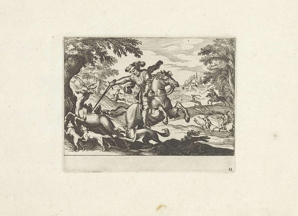 This is an anonymous print entitled "Stierenjacht," or "Bull Hunt," whose date is not known. The scene is rendered in stark monochrome, with dense hatching creating a sense of dynamic movement and chaotic energy. The composition is dominated by the figures of hunters on horseback, engaged in a life-and-death struggle with bulls and dogs. The artist's use of line is particularly striking. Jagged, broken lines convey a sense of violence and instability. The figures are not idealized but rather depicted with a raw, almost brutal realism. The scene is structured around diagonal lines of force which intersect at the center, drawing the viewer's eye to the heart of the conflict. "Stierenjacht" can be understood within a broader context of early depictions of bullfighting that reflect an interest in the aesthetics of violence and the negotiation of power dynamics. The print challenges conventional notions of heroism, presenting a scene that is both thrilling and disturbing. The formal qualities of the artwork serve to underscore its thematic concerns, inviting us to confront the darker aspects of human nature.