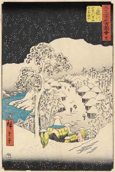This woodblock print, Bikuni Bridge in Snow, was made by Utagawa Hiroshige, likely in the 1850s. The scene depicts a common sight of everyday life in Japan, transformed by falling snow. Hiroshige was part of the Ukiyo-e school, which was supported by the rise of a prosperous merchant class in the Edo period. Artists of this school typically depicted urban life and landscapes, and their works were made available to a wide public. Note the carefully placed figures, bridge and signage, all of which are framed by snow. The print hints at the economic activity supporting the artistic movement. Further, this artwork also speaks to the urbanization and growing commercialization of Japanese society during the Edo period. The ability to produce and distribute prints like these relied on complex social and economic networks. By consulting historical records, economic data, and studies of urban development, we can gain a greater understanding of this artwork and its role in the visual culture of its time.