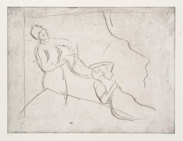 Curator: Before us, we have Leon Kossoff's intaglio print, Bathsheba Reading David’s Letter. Editor: The stark lines and the use of light create such a tense atmosphere. It's as if the weight of the narrative is etched directly into the plate. Curator: Indeed. Kossoff's application of the intaglio technique adds a layer of psychological depth. Consider how the linear marks form the space, evoking both fragility and solidity. It gives the impression of something vulnerable in the open. Editor: And consider the cultural context. The story of Bathsheba is filled with power, desire, and consequence. The artist invites us to consider the role of the female figure in both religious and cultural contexts. Curator: The print's composition, particularly its play of light and shadow, serves to enhance our reading of its intrinsic elements. Editor: Exactly, and by viewing this piece, we become part of a conversation about history, gender, and the gaze. It's a powerful narrative captured with a remarkable economy of line.