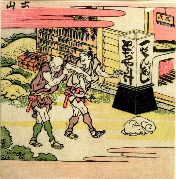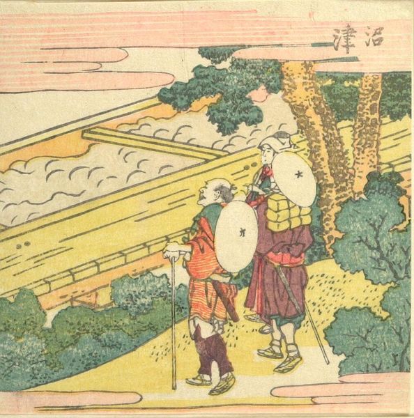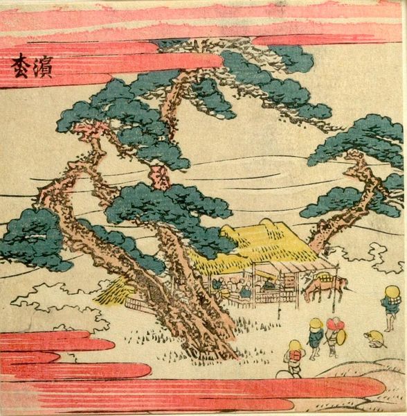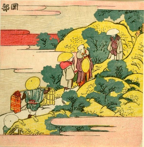Curator:Editor: Here we have Hokusai's "Pilgrim and Travelers Looking at a Cave Shrine, Futagawa." I find the figures quite striking, especially their oversized hats. What can you tell me about it? Curator: The piece speaks volumes about the economic realities of travel and religious devotion in Hokusai's time. Note the woodblock's layering; it reveals a commercial process. The figures' attire hints at their socio-economic status and the materiality of their journey. Editor: So, it is not just about the spiritual journey, but also about the physical labor involved? Curator: Exactly. The print's materiality and production process highlight the commodification of both travel and religious experience. It makes you consider how images are consumed and how that affects our understanding. Editor: That is a fresh perspective; thanks for making me rethink my initial view!
