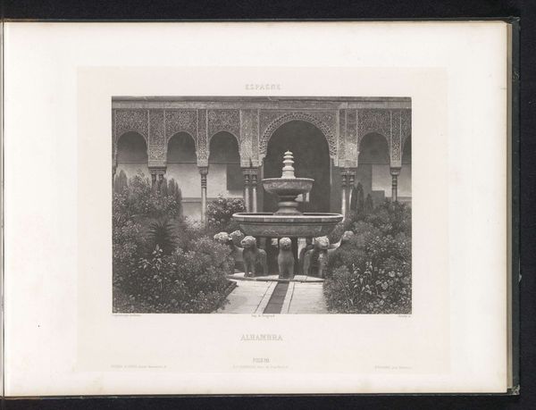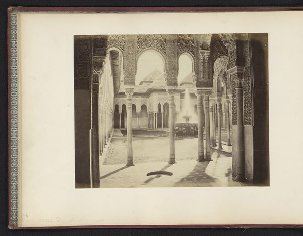 Editor: This albumen print, taken in 1906 by C Maufsaise, is titled "Gezicht op de Leeuwenhof in het Alhambra te Granada, Spanje," or "View of the Lion Court in the Alhambra in Granada, Spain." It feels serene, almost otherworldly. The symmetry and detail are amazing. What catches your eye when you look at this, especially in terms of what it might represent? Curator: Immediately, I’m drawn to the symbolism of the water. In Islamic art and culture, water represents purity, life, and paradise itself. Notice how the fountain is central, not just visually, but conceptually. The lions, although stylized, reference power and royalty, echoing the palace's history and status. Do you see how this interplay creates a sense of enduring legacy? Editor: Yes, I see it. So, the photograph isn’t just a depiction of a place, it’s also about the ideas connected to that place over centuries. Curator: Precisely. Also, consider the interplay of light and shadow. This wasn’t just a technical decision. The contrast emphasizes certain architectural details, inviting us to contemplate what’s revealed and what remains hidden. Does that give you ideas about memory and time? Editor: It does! It makes me think about what we choose to preserve from history, and how our perspective shapes that preservation. Curator: And the "Orientalist" tag assigned to it – how do we approach that loaded term when looking at an image made by a European photographer in this context? Is it celebrating, appropriating, or something in between? Editor: I hadn't thought of that. It makes me question my own initial reaction and how much it is shaped by assumptions. Curator: Indeed. It’s a beautiful, layered image that speaks volumes about power, belief, and representation, inviting us to examine our own understanding. Editor: Absolutely! Thanks for revealing such an amazing complexity.