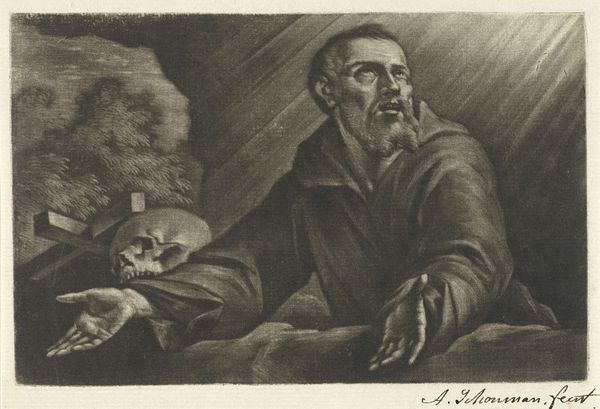 Curator: Domenico Theotokópoulos, better known as El Greco, painted this "Saint Francis Kneeling in Meditation" around 1595 to 1600. You can find it here at the Art Institute of Chicago rendered in oil paint. Editor: Whoa, this painting hits you like a velvet hammer. The dark, almost gothic vibe contrasted with that delicate face of St. Francis is super compelling. It’s like he’s found inner peace right next to a pile of existential dread! Curator: That stark juxtaposition is key. The skull, crucifix, and open book are potent vanitas symbols – reminders of mortality and spiritual devotion. It's a loaded tableau! Editor: Totally. El Greco doesn’t shy away from drama, does he? Even that little wisp of sky visible through the cave opening feels like a desperate breath. Are we sure Francis is meditating, or is he just contemplating his demise? Curator: It's likely both. Saint Francis was known for his intense connection to suffering and mortality as paths to spiritual enlightenment. The downward gaze emphasizes introspection and acceptance. And this placement of a saint within a cave also recalls Saint Jerome. Editor: Good point, about Saint Jerome. That expression... I mean it's melancholic and intense. He really knew how to use shadow to suggest profound inner life. Even the rough texture of his cloak gives him an air of almost fragile vulnerability. Curator: El Greco's Mannerist style amplifies the emotion. See how the hands are elongated, almost weightless? This elegance elevates Saint Francis beyond earthly suffering. It evokes a kind of transcendental grief. Editor: The longer I look, the more the whole thing feels like a stage set for some intense spiritual drama. Is that sprig of ivy a wink at hope and renewal? Curator: Possibly! Ivy, along with its allusions to death and rebirth, also represented eternal life to those seeking solace in their spiritual life. This piece is ripe with duality; earthly, yet otherwordly. Editor: A final, lingering thought… The raw intensity here really bypasses sentimentality. There's something strikingly honest and timeless about this raw encounter with faith and mortality. Curator: Absolutely, the beauty lies in the stark portrayal of Francis facing mortality while still connected to spiritual truth. It transcends any one historical reading.