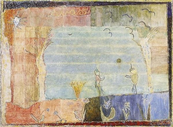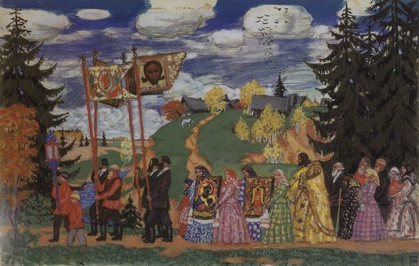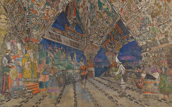 Konstantin Alexeevich Korovin made this sketch of a set for C. Pugni’s ballet, "Trading Pier in the Capital City," with gouache, watercolor, and charcoal on paper. The layering here, the way the colours bleed into each other, speaks to a fluid process. He's not precious, just building the image, finding it as he goes. There's a real material presence to this sketch. The charcoal lines give it structure, then the watercolor softens everything, like a memory. See how the buildings in the background are just suggested, not really defined? And the figures in the foreground are even more fleeting, just blobs of color. That arch at the top, with its stylized foliage and those quirky red figures, it's like a dream within a dream. It reminds me a little of Alexandra Exter's set designs – that same playful sense of space and color. And like Exter, Korovin isn't afraid to leave things unresolved, embracing the messy, ambiguous nature of art itself.