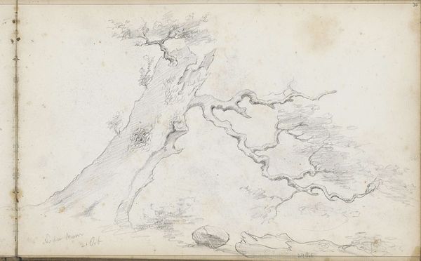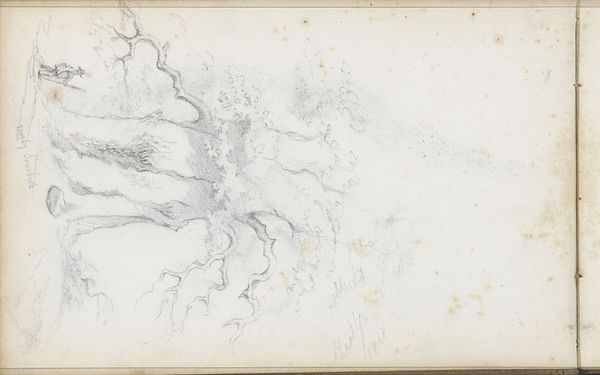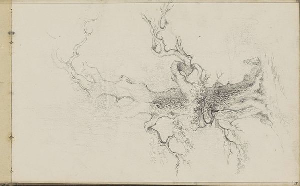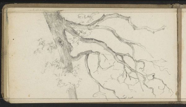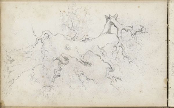 Curator: Today we're looking at Willem Cornelis Rip's pencil drawing, "Man on a Bench Beside a Tree", created in 1874. Editor: Oh, my goodness, this sketch has the same spooky energy as a really old tree you'd find in a fairy tale – all twisty branches, it feels like something could whisper secrets from those boughs. Curator: Rip employs a very deliberate, almost methodical approach to depicting nature. If you look closely, you’ll see how the material quality of the pencil shapes our perception. Its graphite, readily available at the time, allowed for these accessible, quick studies. Editor: Quick is an understatement! I love the economy of lines – the sketch captures this feeling of gnarly old growth, but it is implied as much as explicitly stated. There's a dreamy quality to the sketch too, though it is the very quick observation and technique used that conveys its feeling of fleeting reality. Curator: It's interesting that you mention that "dreamy quality," because Romanticism, from which the image stems, often sought to evoke emotional responses through depictions of nature. The labor is present but understated; we see the hand, the deliberate craft, and its purpose of achieving the affect, almost. Editor: Definitely. And look how he’s almost personified the tree's branches. You see that swirling section right in the middle? It’s staring right at you! It could be something lurking, but I feel a strange invitation into the dream. Curator: Yes, by focusing so intensely on line, Rip blurs the distinction between observer and observed. The viewer participates through recognition of artistic methods. Consider where this sits regarding mass production; Rip's artwork demonstrates art that directly opposes industrial making. Editor: So in a way, it is an intentional pushback, in all its romanticism, to say something of a different spirit? Makes me wonder who was originally seated on the bank next to this peculiar spirit in 1874! Curator: Indeed. Through form and medium, Rip has sparked more inquiry than one may originally perceive at a cursory glance. Editor: And now, after truly considering the means of its creation, the labor involved and the possible rejection of industry and modernity embedded in the artwork itself, it is quite the fascinating and intimate glimpse.