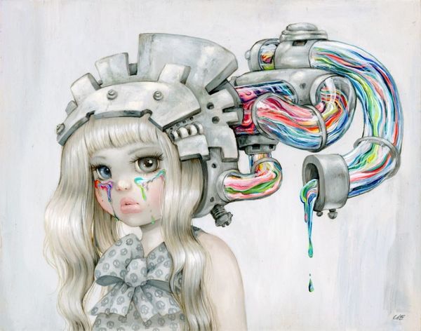 Curator: Here we have Camilla d'Errico's piece from 2016, "The Girl Who Knew Too Much". The medium is drawing, utilizing acrylic paint to realize this surreal portrait. Editor: It’s melancholy yet playful. That cascade of layered, rainbow-colored geological formations bursting from the head gives me the sensation of raw emotion being exposed and transformed into something beautiful, something like mineral wealth. Curator: That geological analogy is quite astute. Considering d'Errico's Pop Surrealist leanings, we can consider these not just pretty colors but the commodification of inner experience. Editor: Hmmm…Commodification? That's a bit cynical, don't you think? Maybe she's reclaiming those spaces within herself that were once off-limits, almost as if it were personal reclamation. The artist transforms something vulnerable into something powerful. Curator: But let’s also remember, the drawing and illustrative techniques highlight a specific labor – a skilled application of line and color that serves both the artist's expression and the demands of a market interested in this style. Editor: Fair enough! It's a dance between artist and audience. It evokes such longing, that tender mouth and vulnerable curve of her neck, the heavy braid—it reminds me of that painful feeling of being burdened by information or the pressures around knowing too much. Curator: Exactly, and it pushes us to consider how knowledge, experience, or even pain can become both a burden and a unique resource. Think about those layers—like sediment deposited over time, building pressure. Editor: I love that analogy. You almost forget her eyes are hidden beneath her heavy bangs, and that the color palette of blues and silvers is at odds with the rainbows growing on her head. It's like holding a secret—this strange contrast makes you yearn to know what she’s hiding behind. Curator: In essence, she embodies a complex set of conditions: cultural pressures, artistic creation as a form of work, and individual emotional processing. Editor: It makes one ponder about the complexities of inner landscapes. That, to me, is something powerful about Camilla's "The Girl Who Knew Too Much". Curator: Precisely; let’s now transition to our next exhibit and consider how material processes intersect.