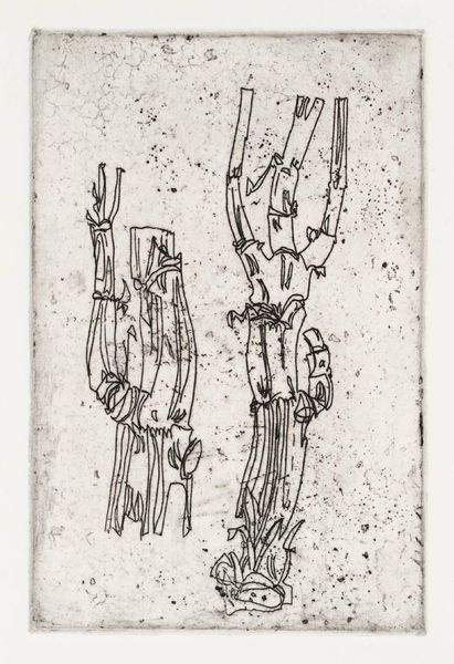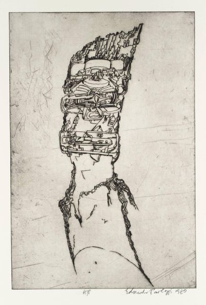Editor: This etching by Sir Eduardo Paolozzi, simply titled "Head," is quite striking. The mechanical details within the head feel like a critique of industrial society. What do you make of the artwork? Curator: Paolozzi, as a Pop artist, often explored the intersection of humans and machines, reflecting anxieties about technological advancements. This “Head” isn’t just a portrait, it's a cyborgian manifesto! How does that sit with your initial interpretation? Editor: That's a great connection. I see it now, less as a critique and more as an investigation of identity in a rapidly changing world. Thanks! Curator: Precisely. By juxtaposing the organic and the mechanical, Paolozzi forces us to confront what it means to be human in an increasingly technologized society. There are no easy answers, only critical questions.
