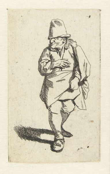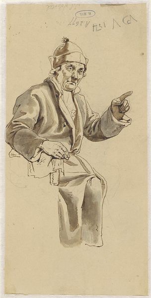 Editor: Here we have Charles Samuel Keene's "Old Man Seated," undated, from the Tate Collections. It's a small drawing, and I'm struck by how casually confident the man appears. What does this drawing tell us about its time? Curator: Keene was a satirical artist. This drawing, while seemingly simple, speaks volumes about Victorian society and class. The top hat, the cane—these are markers of a certain social standing. How might this image have been received by different audiences? Editor: I guess the upper classes would see themselves reflected, perhaps with gentle mockery? And maybe the working classes would see it as aspirational, or else be critical? Curator: Precisely! Keene’s work often appeared in publications like "Punch," shaping public opinion and sparking dialogue. It reminds us that art is never neutral; it always participates in a social conversation. Editor: It's amazing how much social commentary can be packed into such a small sketch. Thanks! Curator: Indeed. It shows the power of art to reflect and influence society.