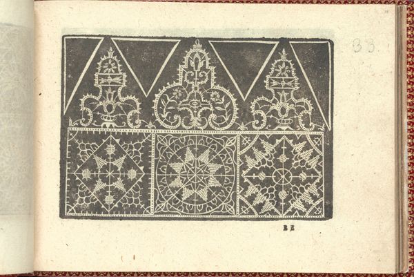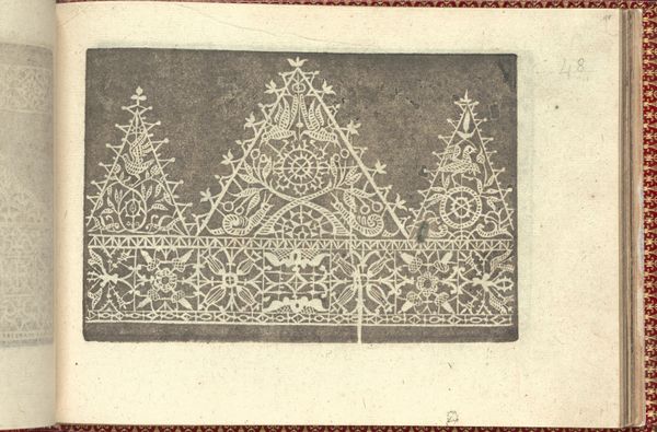 Editor: This page, number 45 from Cesare Vecellio's "Corona delle Nobili et Virtuose Donne," created in 1601, is a fascinating study of lace. It’s just incredible—the detail, the patience it must have taken. The design feels almost architectural. What stories do you think it whispers to us from its time? Curator: Ah, lace! Not just a pretty frippery, is it? Each loop and knot there sings of societal aspiration, of the painstaking skill required to transform simple thread into something exquisite. Imagine ladies poring over these patterns! Do you see the repeating floral motifs, how they’re regimented but still seem to almost…dance? Editor: I do! It’s like structured freedom. I noticed those floral shapes—they look quite stylized, almost symbolic. Is there a language in the lace itself? Curator: Absolutely! Think of pattern books like this one as the 'Vogue' of their day, dictating trends but also reflecting broader cultural values. Vecellio gives us insight into the visual language women would engage with, use to signal status, artistry and refinement, without necessarily speaking it aloud. In some ways, fashion could do more talking than words in that moment in history. What is also quite funny to me here, in an incredibly intricate design, it looks like the lace makers also kept it real and used "corrections". I feel this is where it is a good and bad side, no? Editor: Totally. These aren't just objects; they're time capsules! Seeing the lace 'corrections' is a beautiful metaphor about real vs ideal images. Curator: Precisely! That's what makes old objects new again to us: a portal where the universal meets an experience so precise that our heart aches when understanding the reality that occurred. So next time, let's observe other things people were anxious to conceal. It’s always interesting to dive deeper into details when they reveal so much.