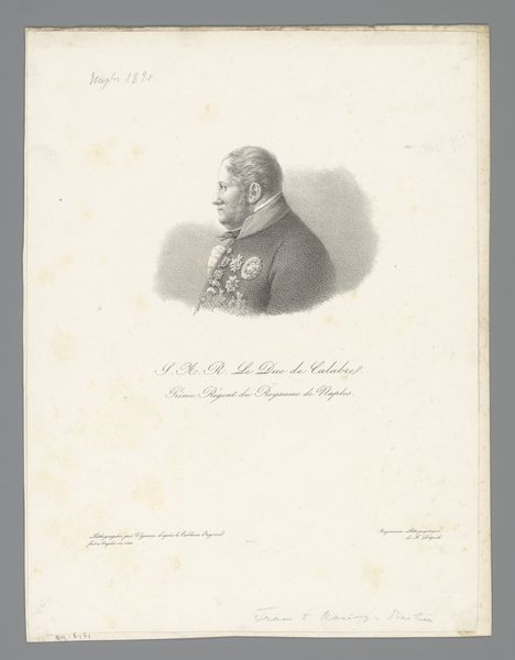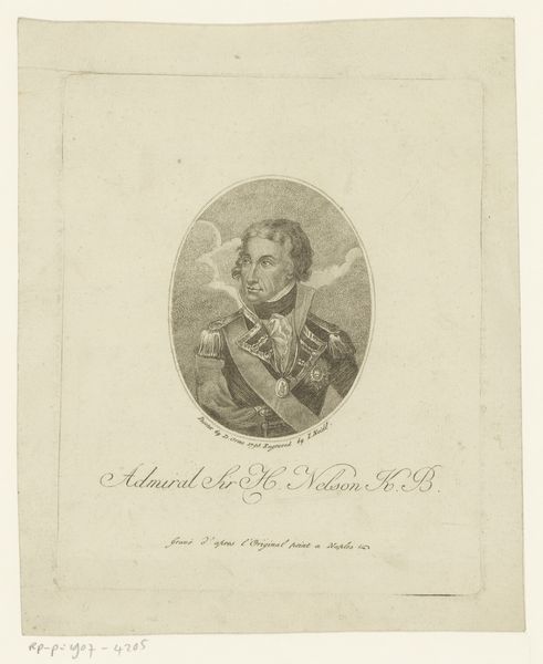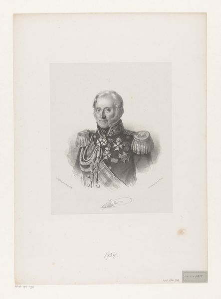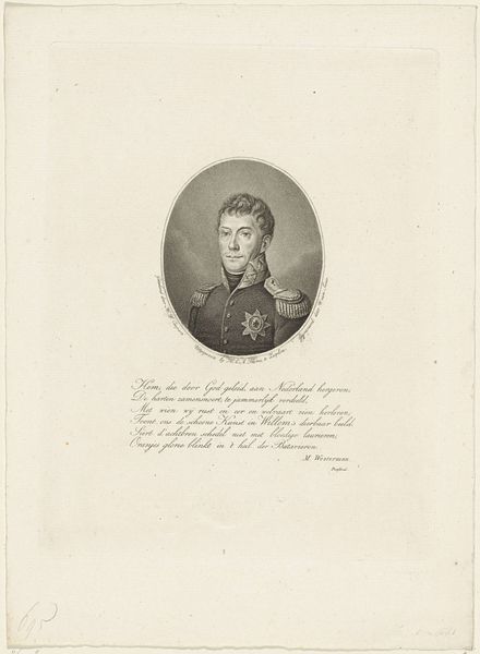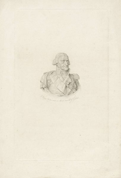Curator: Greetings. Before us, we observe a print entitled "Portret van Leopold Joris Christiaan van Saksen-Coburg," potentially dating to 1816, and currently held in the collection of the Rijksmuseum. It’s attributed to Louis Jean Allais. Editor: My word, he does look rather serious, doesn’t he? Sort of locked in a permanent state of... pondering destiny or perhaps worrying about the grocery bill? I can't decide, but I get the feeling the engraver softened up this ruler a tad. The man has an oddly vulnerable expression set against those severe lines of his military garb. Curator: Indeed. The technique is engraving, where the lines are meticulously incised to define form. Consider the rigorous use of line to create depth and shadow, a technique echoing Neoclassical aesthetics. Editor: Neoclassical—yes, all that control and reserve. It’s clear from those decorations dangling on his uniform. Yet, looking at the shadowing, particularly around his eyes and mouth, I see more of a yearning… a sense of perhaps imposed authority rather than truly relishing power? Curator: Intriguing observation. Semiotically, we read the crisp uniform, and the epaulettes are representative of status, of military leadership, reinforcing societal hierarchies and signifying power dynamics within early 19th century European nobility. The shading sets an immediate mood. Editor: Right! I imagine that living under the scrutiny of courtly life must feel very oppressive, like performing in a never-ending costume drama! What he truly needed was a few pajama days. Perhaps even some Netflix. Curator: (chuckles softly) A whimsical notion. But this engraving is an excellent demonstration of how printmaking served to disseminate images of power and influence during this era. Its formal qualities underscore its function as a representation of authority and status. Editor: Still, behind all that gilded presentation, you sense the human, maybe wrestling with being a symbol more than a person, perhaps that comes through despite those sharp lines and neoclassical angles. Curator: Indeed. Art allows us to interpret not only history, but human psychology. Editor: Precisely. Who knew a bunch of meticulously carved lines could speak volumes about our interior life?