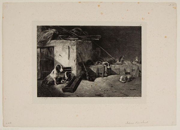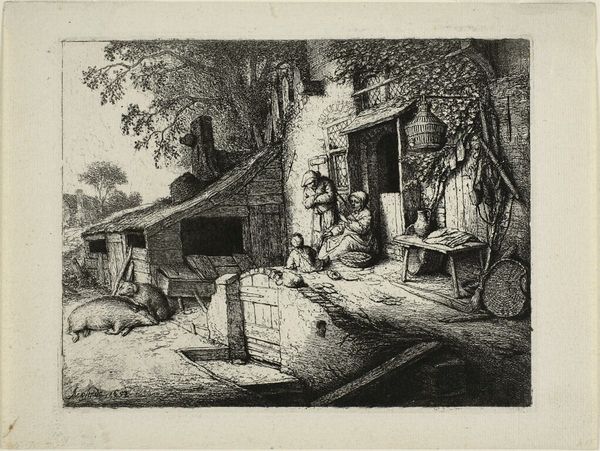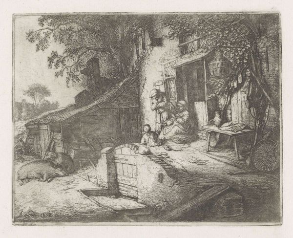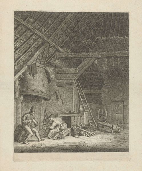 Jacob Louys's etching, *Interior of a Barn with Mother and Two Children*, invites us into a rustic scene rendered in careful detail. The composition is structured by the strong diagonals of the barn's roof, which converge to create a compelling sense of depth, while the delicate hatching creates a sense of light and shadow. Louys uses the architecture of the barn not just as a backdrop, but as a framework within which he explores themes of domesticity and rural life. The figures, though small, are central to the work. Consider how the arrangement of the figures relates to the interior's architecture, embedding human existence within a structural matrix. The texture, achieved through intricate line work, highlights the roughness of the materials – the wood, the straw, the earth. This etching offers a carefully constructed view of everyday life, inviting us to look beyond the surface and see how space and form shape our understanding of domesticity. The barn's interior becomes a stage, each element carefully placed to tell a larger story about life's structures.