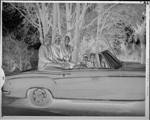 Editor: This striking silver gelatin print, "Untitled (family riding in convertible)" by Lucian and Mary Brown, has an eerie, ghostly quality. What can you tell me about the materiality and process behind this image? Curator: The negative print immediately draws attention to the labor involved in photography. The reversal of tones forces us to consider the chemical processes and the social context of image-making. What statement were the Brown's making about themselves, as African-Americans? Editor: So, you're saying the medium itself is part of the message? Curator: Precisely. Consider the labor of producing and consuming images, and how that relates to class and identity. Editor: It's fascinating to think about photography not just as capturing a moment, but as a product of specific materials and social conditions. Thanks for the insight! Curator: My pleasure; seeing art in that way really enriches our understanding of it.