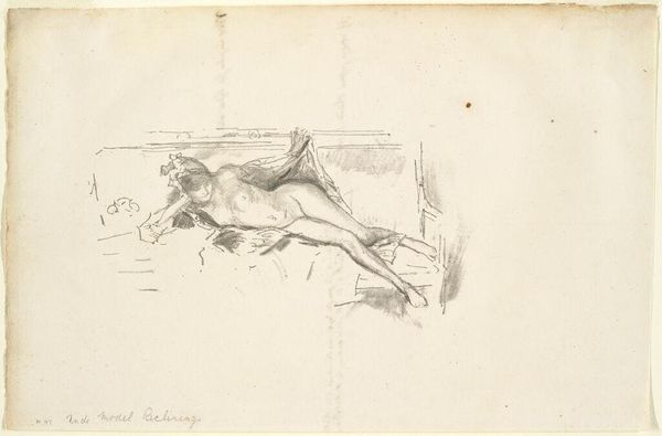Curator: This is John Singer Sargent's "Wounded Warrior, after the Antique," a pencil drawing in the collection of the Harvard Art Museums. Editor: The rapid strokes give it such a raw, immediate feel. It is visceral, showing the moment where strength falters. Curator: Precisely. Sargent's drawing captures a potent image of broken heroism. The raised arm, the shield... they speak to familiar narratives of classical struggle. Editor: Yes, but it’s more than just classical. Note the pressure of the pencil, the areas built up into darker values, all revealing the labor of the artist. The making is so present. Curator: It's interesting how Sargent invokes an archetypal image of a fallen warrior—the cost of courage, perhaps, resonates across centuries. Editor: I see it as a study in form and also the limitations of the body. The warrior, the pencil, the paper, all material components interacting. Curator: A worthwhile reminder that even preliminary sketches hold layers of cultural and artistic significance. Editor: Indeed. It's in these material traces that the artist, and the warrior, live on.