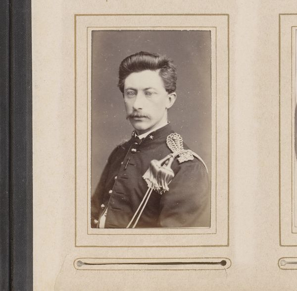Albert Greiner captured this portrait of a young man in military uniform using photography, a relatively new medium at the time. The image presents an interesting tension between the sitter’s youth and the authority connoted by his military attire. Dating from the 19th century, this Dutch photograph reflects the growing professionalization of the armed forces across Europe, and the use of new technologies like photography to document and celebrate this development. The stiff pose and formal dress suggest an attempt to project an image of strength and order, values highly prized in military culture. However, the subject's youthful features and slightly disheveled hair also hint at the individual behind the uniform. To fully understand this work, we might delve into military archives and genealogical records to learn more about the sitter and the specific regiment he served in, uncovering the social and political context that shaped both his life and this image.