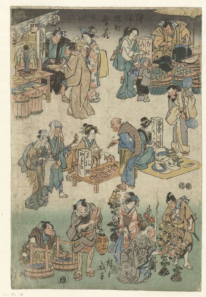 Editor: So this woodblock print, "Avondmarkt met straattheater in de Joruri straat," created by Utagawa Hiroshige in 1852, it just bursts with such everyday energy! There’s almost too much to take in – figures crammed into every space. I'm curious, what's your reading of the atmosphere here? Curator: Ah, you've nailed it! It’s controlled chaos, isn't it? Hiroshige really captured that dizzying energy of a night market. But look closer – there's this underlying sense of observation, of him just documenting. Almost as if he's saying, "Here, look at my vibrant Edo!" He is immortalizing daily life. See those individual interactions? Notice how detailed the clothing patterns are! Does it spark your imagination? Editor: Absolutely! It’s a window into the past. All those tiny figures... How did he manage such detail in a woodblock print? Curator: Magic, pure magic. Well, meticulous craftsmanship too, of course. Think of each color requiring a separate block – imagine the registration! But back to the atmosphere... what details give you the most sense of this being an *evening* market? Editor: Hmmm… maybe it’s subtle, but I see an increased intimacy with the close proximities. It looks like families are really connecting in a way you may not see in daylight. Curator: Wonderful point. The compressed space might not signal nighttime initially. This speaks to Utagawa's brilliance: not hitting you over the head but slowly drawing you into the picture. You perceive its truth – maybe on your second or third look. You might say it is not photorealistic but true. And that's the art of *ukiyo-e*. Do you appreciate Utagawa more now? Editor: I definitely do. It's more than just a snapshot; it's a carefully constructed moment, a slice of life elevated to something beautiful. Curator: Exactly! That’s what makes this, and ukiyo-e in general, so perennially fascinating. It invites us to participate, to imagine ourselves right there in the Joruri street, breathing in the night air, amidst the hustle and bustle. What a beautiful snapshot in time, full of energy!