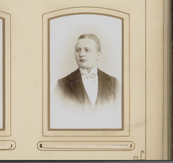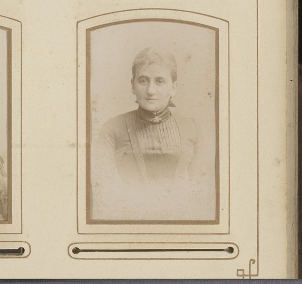 Curator: This is “Portret van een jonge vrouw,” or "Portrait of a Young Woman," a photograph taken sometime between 1900 and 1910 by Globus Atelier. The photographic print, displayed here in its original album mount, invites a quiet, considered gaze. Editor: She almost seems to float, doesn't she? Sepia tones melting into a creamy background, face just sharp enough to hold your eye but soft around the edges, like a memory clinging to paper. Curator: The hazy quality speaks to pictorialism, a style that prized artistic effect over sharp detail. This photograph might be a gelatin silver print, a common process that allowed for tonal range manipulation in the darkroom. Editor: Right. I wonder what went through the mind of someone manipulating that chemistry, choosing what to reveal and what to obscure? Was she pleased with how it revealed her inner self, her era, or was this a constructed identity for a photographer's studio? Curator: Given its historical context, consider the shift from individualized craft to mass-produced image culture that was occurring at the time. This Atelier was catering to an emerging market of portraiture, blending artistic aspirations with commercial needs. Editor: So, each photograph meant not just capturing an image but navigating a world in the cusp of modernity... Did people realize how radically they were documenting and reshaping how they remember one another? Now when I see this image I also see that broader industrial picture. Curator: It underscores how photographs became both individualized records and mass-produced commodities shaping social memories. We think of photography now as instantly reproducible, but back then, these materials had particular resonance tied to labor and processes. Editor: Thank you, those points highlight the paradox of its tangible feeling while being industrially made, and now, even virtually seen! It is as though holding the memory itself. Curator: Indeed. It invites consideration of shifting social practices surrounding self-representation and memory. Editor: Right. Makes me want to wander back in time and feel its grain.