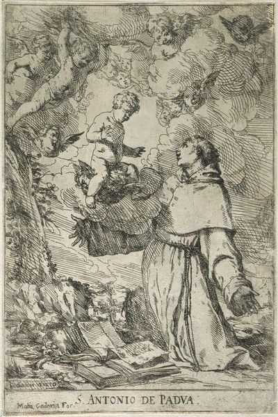 Curator: This is "Esau Selling his Birthright" by Peeter Rodtermondt, now residing at the Harvard Art Museums. Editor: Wow, just look at that etching! It's got such a strange atmosphere, almost dreamlike, and unsettling with the bird on the pedestal. Curator: Rodtermondt's handling of the etching technique really brings forth the commerce happening between the biblical figures, and their surroundings. Editor: Right, the material exchange feels almost grotesque. I can't help but wonder if it's meant to serve as a dark commentary on our own consumption habits. Curator: Precisely, the work provides a glimpse of labor relations, questioning artistic practices. Editor: It makes you think about what we value, doesn't it? Pretty thought-provoking. Curator: Indeed, the artist makes us ponder about the cost of things and how the process can shape the final object and its reception. Editor: Definitely makes you see beyond the surface, a compelling piece!