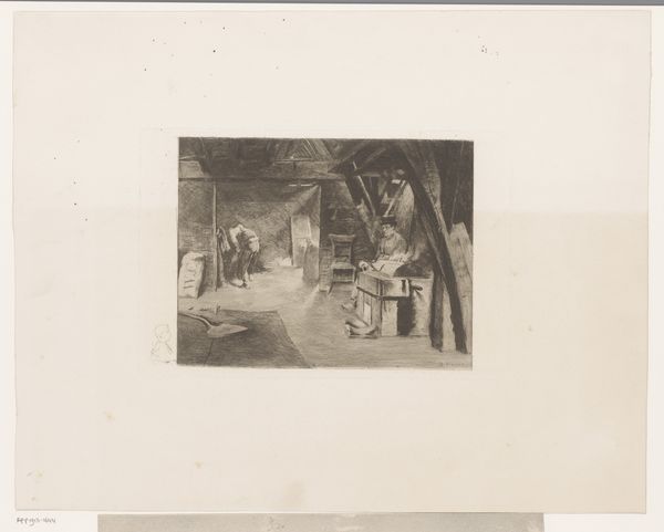 William Henry Fox Talbot created this photograph, whose date is unknown, using the calotype process, an early photographic technique, which renders the scene in soft, sepia tones, creating a visual experience that feels both intimate and distant. The composition features two figures engaged in labor before a rustic structure. Talbot's choice of the calotype, with its inherent softness and tonal range, challenges the pursuit of perfect mimetic representation. Rather, the grainy texture and diffused light create an image where form is suggested rather than precisely delineated, nodding to a semiotic understanding of representation as a system of signs. The figures, while present, are somewhat abstracted, their forms blending with the landscape. By embracing the technical limitations of his medium, Talbot draws attention to the materiality of the photographic process itself, opening a space for interpretation and re-interpretation. The photograph then isn’t just a window to the world, but a constructed reality that reflects cultural and philosophical questions about visibility, representation, and the nature of human experience.