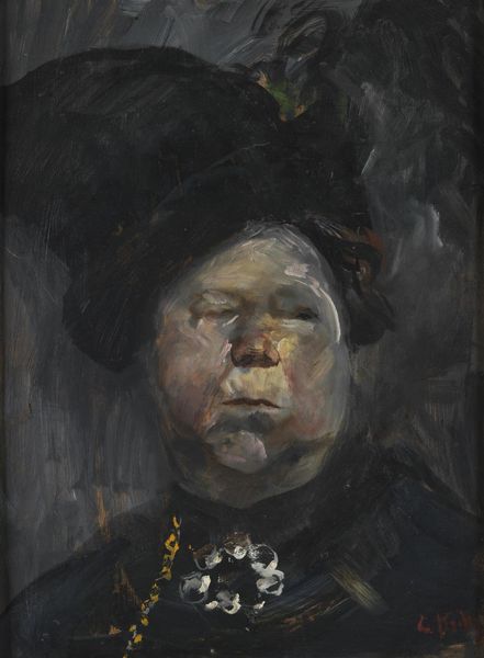 Editor: So, this is Olga Boznanska's "Portrait of Anna Ginzberg" from 1900. It's an oil painting, and I'm immediately struck by how…unsettled it feels. The figure almost seems to be emerging from the shadows. What do you see in this piece? Curator: The shadows you mention are key. Boznanska’s use of chiaroscuro – that stark contrast between light and dark – isn't just about technique; it's deeply symbolic. It speaks to a specific moment in European intellectual history. What feelings do you associate with these strong contrasts? Editor: Definitely a sense of mystery, and perhaps a touch of melancholy? The dark colors make it feel very inward-looking. Curator: Exactly. The late 19th century was a time of great social upheaval, with new ideas about psychology and the self emerging. Look at the impasto, the thick application of paint. Doesn’t that seem to express a certain...emotional turbulence? The brushstrokes themselves become carriers of feeling. Editor: It does. It’s like she’s building up this persona, layer by layer, almost hiding her. It’s interesting that you see that as turmoil rather than calm, though. Curator: But isn’t there a potent stillness beneath it all? That dark clothing she wears almost veils her identity. Boznanska offers a coded message, the memory of an historical moment. This wasn't just about likeness; it was about capturing the soul in a changing world, the uncertainty but also strength it holds. Editor: I see what you mean. It’s like the painting is a veil itself, and we are seeing the woman and that era partially obscured by it. So it is unsettling, but that says more about its era and her position within it. Thank you. Curator: And thank you for bringing fresh eyes to this striking portrait, allowing it to tell a story.
