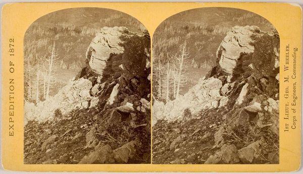Curator: O'Sullivan's stereograph, Cañon, Valley of the Conejos River, takes us to the 1874 Expedition led by Lt. Wheeler. It's a small, intimate window into a vast landscape. Editor: It feels like a sepia-toned dream. I'm struck by the stillness, that single figure gazing out... he seems so small against the magnitude of the valley. Curator: That smallness is key, isn't it? These expeditions aimed to map and document the West, framing nature as something to be conquered and understood. The figure becomes a surveyor, a marker of scale. Editor: Yet, the image evokes such quiet awe. The textures in the trees, the way the light filters through... it's a romantic vision, even with its scientific purpose. The romanticism of conquest. Curator: Exactly. It's a visual manifestation of manifest destiny, an attempt to possess the land through representation. The double image even asks us to examine closely. Editor: So, a meditation on power, disguised as a landscape... which still leaves me breathless, strangely enough. Curator: It's a testament to the enduring power of images, isn't it? They can hold so much, even contradictory narratives, in such a small frame.