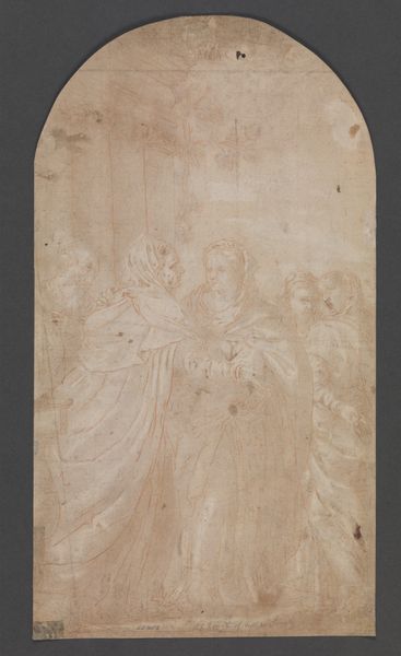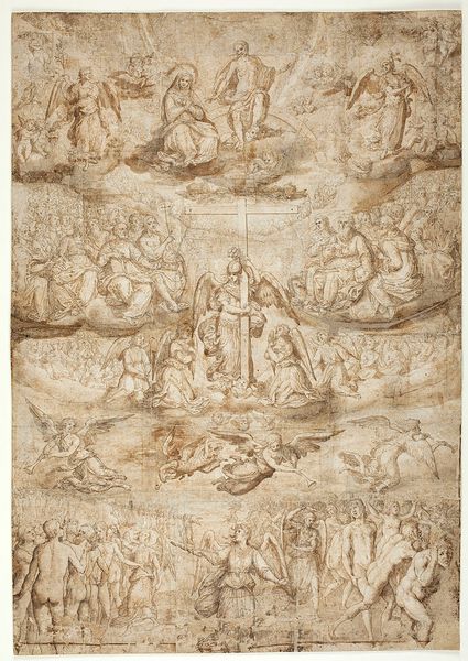 This is a sketch by Bartolomé Estebán Murillo, rendered in sepia ink, presenting the Virgin Mary with the Christ Child amidst celestial clouds. The composition immediately strikes us with its dynamic arrangement: figures ascend in a spiraling fashion, drawing the eye upwards towards a divine light implied at the very top. Murillo masterfully employs a limited tonal range to create depth and atmosphere. The wash technique blurs the edges, softening the figures. The Virgin and Child at the pinnacle are bathed in the lightest tones, symbolizing purity and grace. Below, the earthly figures gesture upwards, their forms more defined, yet still softened by the medium. The use of line, particularly in the drapery, suggests movement and emotion. The overall effect is one of transcendence, where the boundaries between the earthly and divine blur. This piece not only demonstrates Murillo’s technical skill but also invites us to consider the structured ways in which religious narratives are visually constructed and interpreted.