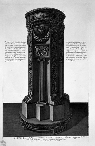 Editor: Here we have Giovanni Battista Piranesi's "Tripod or ancient marble altar found at Ostia in 1775." It is an engraving and really captures the monumentality of ancient Roman artifacts. What do you see in this piece, looking at it from a historical lens? Curator: Well, it's fascinating how Piranesi, through this engraving, is not just depicting an object but also engaging in a discourse about cultural authority. This altar, discovered during a period of intense archaeological excavation, immediately becomes a symbol, doesn't it? Of Rome's glorious past, yes, but also of the Papal States' claim to that legacy. Notice the prominent display of detail - almost an archaeological record within an artistic rendering. Editor: Yes, it feels like he’s trying to document everything meticulously. Is that related to how these discoveries were perceived at the time? Curator: Absolutely. The level of detail, the almost scientific approach, reflects the Enlightenment's obsession with cataloging and understanding the world through empirical observation. But consider too, that Piranesi wasn't just an artist; he was also an antiquarian deeply invested in promoting a specific narrative about Rome's supremacy. This image then functions as both art and propaganda. Who was the intended audience here? Editor: Presumably other artists, collectors… influential people who shaped the artistic and cultural landscape of the time? Curator: Precisely. Engravings like these circulated widely, influencing tastes, styles, and even political ideologies. It's not simply about representing a marble altar; it’s about shaping the perception of Rome's place in European history. It forces us to confront the complexities of art's role in constructing historical narratives. Editor: I hadn’t considered the political dimensions so explicitly. I am learning how artworks participate in broader social and political conversations! Curator: Exactly, it highlights how museums and the art market themselves become active participants in this narrative construction.