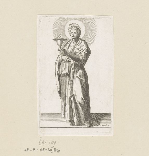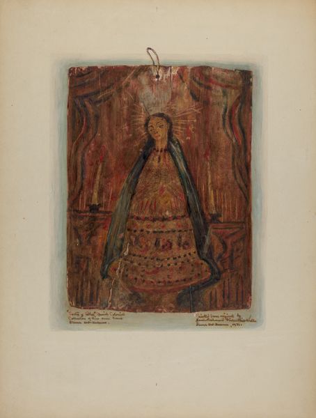 Curator: Standing before us is "Statue of Santo (probably St. Dominic)", a 1941 watercolor by Juanita Donahoo. Editor: It’s surprisingly earthy. The watercolor rendering almost mimics the texture of aged wood or stone, it gives a sort of solidity to something normally so ephemeral. Curator: Precisely. The choice of watercolor is interesting considering the subject; the Santo statues themselves are key components of religious expression in specific cultural contexts. Their materiality matters. Editor: Tell me more. How were they used, these Santo statues? Was there any power in the materials, or craftsmanship? Curator: Historically, these statues played a significant role in religious life, often serving as intermediaries between the divine and the everyday world. For local communities, acquiring or creating these statues reinforced communal bonds, becoming central to the religious culture. Editor: It does feel deeply devotional, particularly as Donahoo frames the figure. What catches my eye is the use of color. While some might expect brilliant, divine hues, there's this muted palette suggesting age and permanence. Is it commentary or pure observation? Curator: It's challenging to be definitive, but I'm inclined towards a societal observation, or influence. Academic art of this time served to reinforce ideals through specific historical contexts. Think of the way folk art gained increasing interest and a public platform at this time. Editor: But there's also a sense of immediacy. Watercolor lends itself to a quicker pace, doesn't it? More immediate than carving wood, for instance. It democratizes representation. Is the artist then attempting to democratize religious icons? Curator: Perhaps "democratize" isn't quite the word, but certainly to engage with its cultural presence beyond its sacred value, and perhaps to acknowledge its historical journey into modernity through its representation, wouldn't you agree? Editor: Yes, that strikes a better balance. Seeing Donahoo’s Santo this way is a thought-provoking experience. Thank you. Curator: It allows us to see a convergence of art, material culture, and historical narratives, offering layers of insight.
