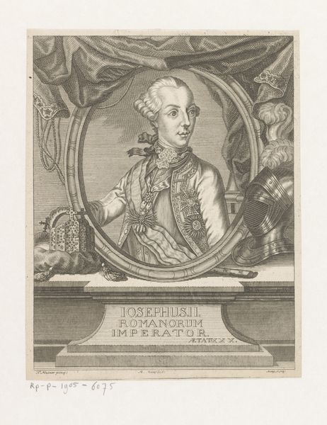 Curator: We're looking at a print from 1764 titled "Portret van Ferdinand I, koning der beide Siciliën," created by Filippo Morghen. It's an engraving depicting Ferdinand I, King of the Two Sicilies. Editor: My initial reaction is…power. But an odd kind. There’s a distinct sense of almost childish authority on display here, reinforced by the composition. The circular frame feels confining. Curator: It’s fascinating how the Baroque style melds into Neoclassicism here. Notice the precise lines, the meticulous detail in the royal garb, contrasted with the subject's youthful appearance and the slightly sentimental quality typical of Baroque portraiture. Semiotically, the oval border suggests the idea of containing absolute monarchical power within a carefully defined social order. Editor: Right, and if we look at this portrait within the context of 18th-century power structures, it reveals the constructed nature of monarchy itself. Ferdinand, depicted as a boy, is propped up by symbols - the crown, the ermine, the Latin inscriptions. He wasn't inherently powerful; his authority was conferred upon him, even manufactured. Note the line at the bottom. "Philippus Morghen". His function in maintaining the image of monarchy through reproduction cannot be overlooked. Curator: Absolutely. Morghen’s mastery of line and shading creates an incredible sense of depth, giving Ferdinand a three-dimensionality that contrasts with the flat, decorative elements. It creates an intentional tension between realism and idealization, which makes this so unique for the time. Editor: But also consider the intended audience for a print like this. It circulated amongst the elite, reinforcing their perceptions of dynastic power and legitimacy. But for those excluded from the circle, it might represent something very different, maybe even an absurd caricature. Looking closely you will also notice Latin phrases at the bottom of the image that translate to complex lineage claims of a king who has absentee parents from Spain, referencing a moment of political upheaval that would ripple for generations. Curator: It is indeed a document reflecting the complex political climate of its time, and filtered and made even more nuanced through a masterful execution and use of the media. Editor: It encourages us to question how we visualize and legitimize power itself, yesterday and today.