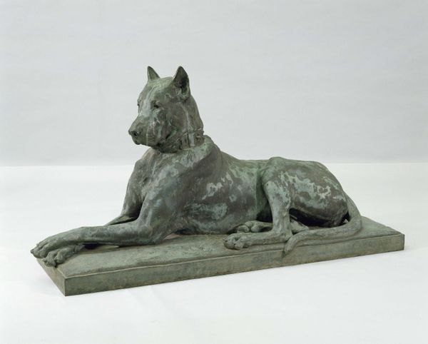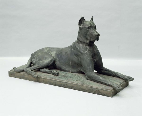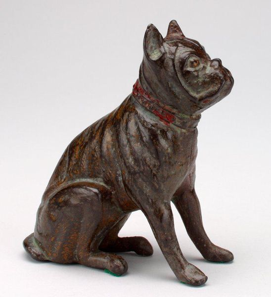 Editor: Here we have “Pig with Bow” still bank, dating back to 1899, by the Shimer Toy Company. I am instantly struck by how charming and subtly unsettling this little metal sculpture is. That tiny bow…it almost feels forced. What are your thoughts on this little piggy? Curator: Well, first, its metallic surface whispers tales of a time when even piggy banks possessed an air of industrial solidity. You sense the weight, don't you? And the bow! Oh, that jaunty bow… it's pure, unadulterated Victoriana. It's that era’s obsession with dressing things up, isn’t it? Humanizing them, claiming ownership, or perhaps simply distracting from something more… raw. Does it perhaps remind you of something lurking under our controlled and mannered behavior? Editor: Absolutely! It makes you wonder who this little bank was intended for. A child, obviously, but what kind of childhood did they experience if their bank was a somewhat ominous, metal pig? Curator: That's it! The Shimer Toy Company may have aimed for innocent fun, but a metal pig—durable, cold—suggests lessons of financial restraint or maybe even a quiet, lurking fear of…lack. And remember this era when everything was connected with symbolism; nothing happened by coincidence, from colors of dresses, names, pets... Did piggy banks become some status symbols at a certain point, or teaching examples to save money instead of spending it on fun items and frivolity? Editor: That's fascinating! I hadn't thought of it that way. Seeing it as more than just a children’s toy, but a coded cultural artifact. It sounds so serious! Curator: Perhaps a tad dramatic, but all of art has at least one potential answer hiding in it. It reminds us that objects, even playful ones, carry stories embedded within them. Editor: True! The pig bank feels more than just cute and antique—it’s a time capsule! Curator: Precisely! Sometimes the most whimsical creations contain the most profound secrets.