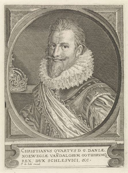 Editor: This engraving by Dominicus Custos depicts Peter, Count of Fuentes. He looks every bit the imposing military figure. What symbolic weight does his image carry? Curator: Consider the armor: a symbol of power and protection, but also of the burdens of leadership. Notice the cross and fleur-de-lis. What values do they represent, and how do they shape our understanding of his role? Editor: So, the artist uses these symbols to convey the Count’s authority and religious affiliations? Curator: Precisely. And the inscription framing him…it all contributes to a carefully constructed image of a man defined by duty and faith. This was a calculated message. What feelings does it evoke? Editor: It's interesting to consider how such portraits were designed to shape public perception. Curator: Indeed. Images can speak volumes across centuries, carrying the echoes of cultural memory.