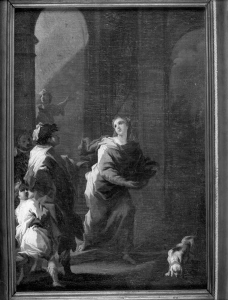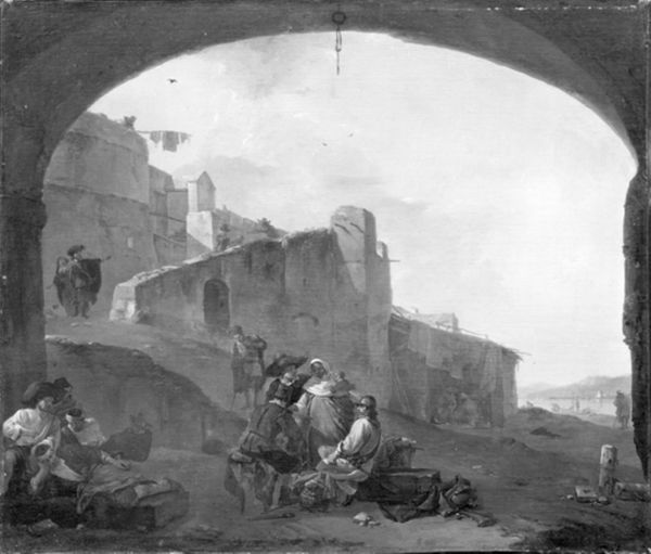 Simon de Vlieger's "Hunters at Rest," painted in oil on canvas, presents a study in contrasts, a tableau of light against shadow. The composition divides into two distinct zones: a brightly lit fountain area contrasted with a cavernous, dark opening. The fountain, a semiotic marker of civilization, is bathed in light, drawing our eye to the figures and their resting hounds. Conversely, the dark archway invites speculation, its obscurity a stark contrast to the fountain's clarity. This interplay isn't just visual; it hints at a deeper structural dichotomy between the known and the unknown. De Vlieger manipulates the scale of light and shadow to create a sense of depth. The figures, though small, are central to this dynamic, mediating between the two realms. Note how the light is not merely representational but structural, shaping our perception and directing our gaze. The tension between illumination and obscurity invites us to consider the painting not as a mere depiction but as a carefully constructed space where light and shadow engage in a constant dialogue.