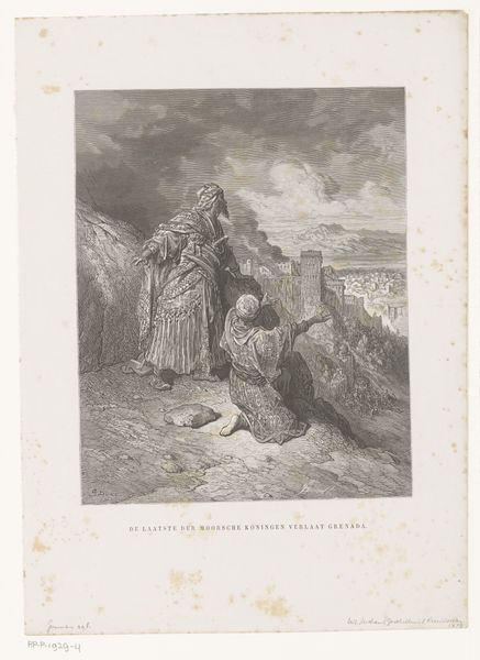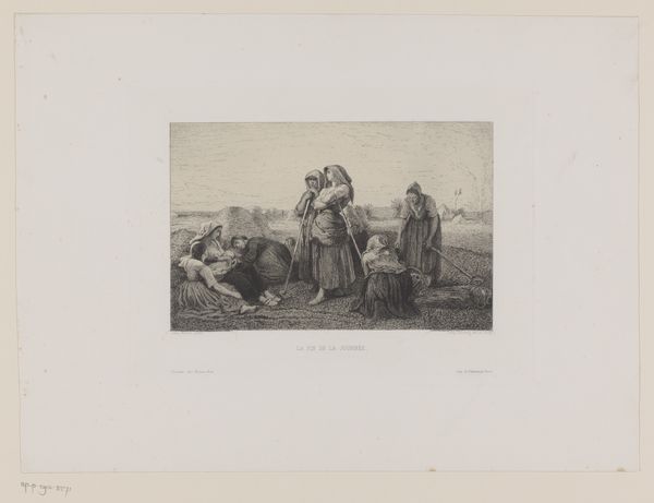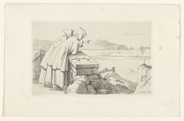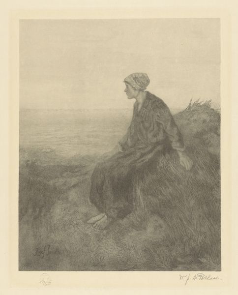 Curator: We're looking at Frederik Hendrik Weissenbruch's "Oude vrouw leunend op stok," dating from 1861-1863, currently held in the Rijksmuseum. It’s an etching depicting an old woman leaning on a stick. Editor: The composition is striking; the somber grayscale tones evoke a sense of melancholy. The texture and light play off one another. Curator: Indeed. Consider the technical proficiency of Weissenbruch's etching technique. Note the meticulous lines creating depth and shadow, focusing our attention on the old woman. Her hunched posture communicates resilience. The print relies on line and tonal variation, expertly manipulating the etching process for atmospheric effect. Editor: And doesn't the imagery carry significant weight? The lone figure of an aging woman evokes thoughts of precarity and isolation—reflecting the vulnerable position of women in Dutch society during this era. Her gaze is fixed on those distant ships. What must she be thinking, watching lives go to sea, or waiting for loved ones to return? It speaks of economic challenges and social upheaval. Curator: It also exemplifies Realism's interest in depicting ordinary life with unvarnished detail. Notice how the texture of her garments and the roughness of the dunes are faithfully rendered. Editor: Precisely, though, at the time the landscape tradition had romanticized the past and the local. Realism’s gritty lens gave voice to unspoken aspects of experience for the elderly and working classes, for example. Her downcast expression conveys burdens that are etched on her as much as the artist has etched lines into the metal plate. Curator: Weissenbruch used etching to evoke textures masterfully, drawing attention to this one character with a great presence within an open horizon. Editor: By engaging with the historical contexts that shaped the art and its subjects, we become alert to those complexities. What can you find when you look? Curator: A great discussion; thank you. Editor: Likewise, it's been an eye-opening journey into Weissenbruch’s work!