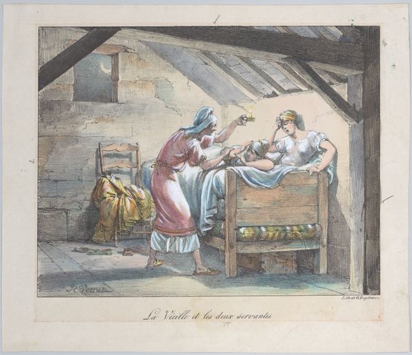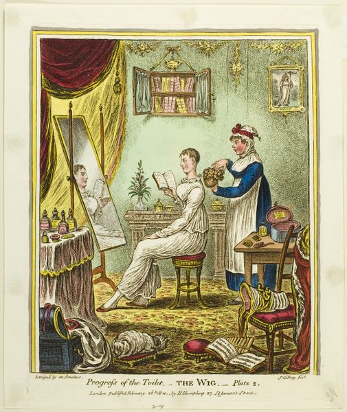 Curator: Ah, yes, "The Stays, plate one from Progress of the Toilet," likely created around 1810 by James Gillray. It’s an etching, printed on paper, now residing here at the Art Institute of Chicago. My initial impression is one of controlled chaos, the eye zigzags everywhere. Editor: Controlled is an interesting word for this. My first thought was rigidity—everything seems forced into place, both the woman and the composition itself, doesn't it? The hyper-defined lines seem almost aggressively structured. Curator: I think the rigidity you’re observing is crucial. Corsetry, the act of lacing the "stays," as they were known, was deeply tied to constructing and constraining feminine identity. It’s not simply about fashion but about power, control over women’s bodies, and societal expectations. What we see isn’t merely an image, but an encoding of contemporary gender norms. Editor: Precisely! It speaks to a kind of architectural approach to the body, doesn’t it? The woman is being built, constructed almost like the room around her. Notice the contrasting textures, the softness of the fur of the dog versus the smoothness of her skin or the defined edges of her undergarments. Even the colour palette plays a role – that fleshy pink hemmed in by the rigid ochre of her stays. It's masterful. Curator: And it is indeed worth delving into what those compositional and stylistic elements reveal, as this print comments on ideas of luxury, class, and performativity. Consider also how Gillray implicates us, the viewers, in this process of scrutiny. What are we invited to consider beyond mere physical appearance? What does it mean to participate in a gaze that upholds, even reinforces, systemic power imbalances? Editor: The mirror adds another layer. She gazes not just at herself but toward the viewer, while also the mirror reflects what appears to be an anthropomorphic likeness for further visual consumption. Very clever. So it becomes a study in self-surveillance. It brings a completely contemporary view of social expectations into sharp relief! Curator: It truly invites us to reflect on these intersecting power dynamics within representation, reminding us of how they operate even today. Editor: Well, I find my appreciation for Gillray's print deepened, seeing now past its beautiful textures and clever mirroring, but also the powerful social critique it holds.