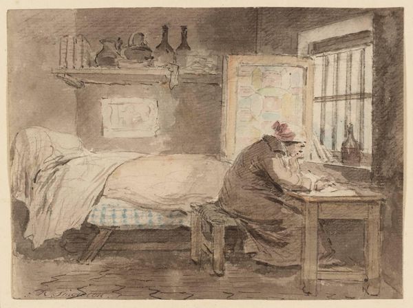 Abraham van Strij created this watercolor, "Interior with Family," providing an intimate glimpse into Dutch domestic life. Born in 1753, Van Strij came of age during a time of social and political transformation in Europe, where traditional family values were central to society's structure. Here, the artist invites us into a private sphere, a humble home filled with the quiet activities of family life. A woman tends to laundry near the fireplace, while another figure sits by the window, perhaps sewing or mending. Children gather around a cradle, their faces suggesting a mix of curiosity and contentment. The scene evokes a sense of warmth and belonging. Yet, beneath the surface of domestic tranquility, questions of gender and labor emerge. The women are engaged in household tasks. The division of labor reflects the social norms of the time, where women were often confined to the domestic sphere. Through this depiction, Van Strij both celebrates and subtly comments on the roles assigned to women within the family unit. The scene invites us to consider the complexities inherent in representations of family and domesticity.