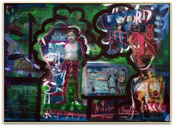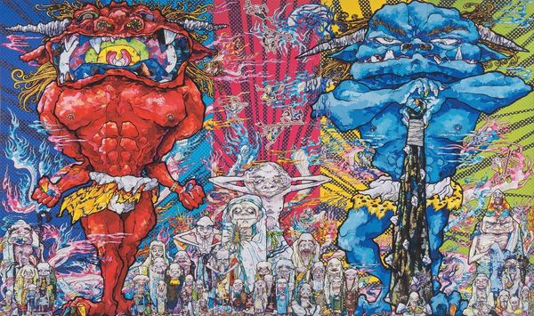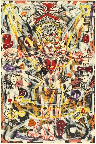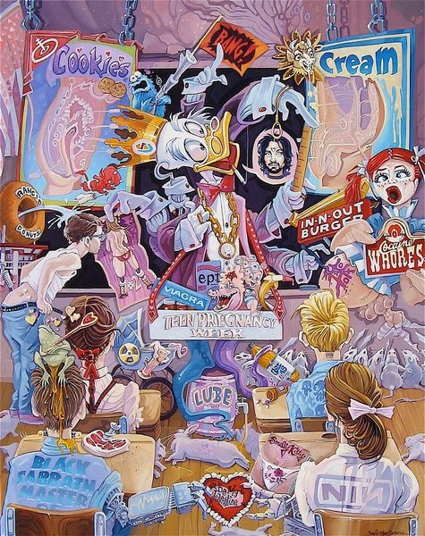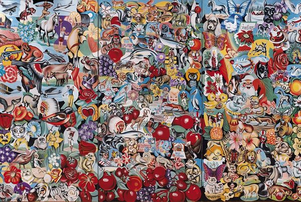 Curator: We're looking at Dave Macdowell's work, "Dope Fiend Massacre." It's an acrylic piece that really grabs your attention with its sheer density of imagery. Editor: My first impression is chaotic carnival, a vibrant yet disturbing collection of cultural detritus. I immediately notice the hyper-saturated colours. Curator: Exactly. And each element feels meticulously placed to clash with its neighbor. What’s interesting to me is how it situates itself in conversation with a history of protest art. The statements included offer such raw commentaries, that make it incredibly impactful. Editor: Visually, the recurring motifs of eyes, mouths, and genitalia signal a breakdown of communication and consumption gone wild. The text "The Narrative is a Lie" really drives that home for me, becoming a lens to question authority and social narratives. The prominence of televisions showing devils or butterflies suggests a concern with propaganda. Curator: The artist uses such strong symbols throughout this piece. I think it speaks to this wider narrative of cultural saturation and critique, it reminds me of punk ideologies. Do you see Macdowell echoing similar sentiments? Editor: Absolutely. This collage echoes historical roots in pop-art, like a critique of our visually overloaded society. I find his choices very evocative; and his art a sign of changing realities. The butterfly as a metamorphosis of sorts for changing times and societies? Curator: Yes, the symbol is multi-layered and so compelling! This almost relentless image really feels to say something about being in the throes of transition as a society, with an overwhelming sense of uncertainty. Editor: It's a cacophony of signs vying for our attention, a mirror reflecting the anxieties of our hyper-mediated age, a journey through culture itself.