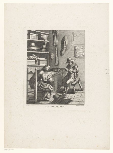 Editor: This engraving by Jacques Louis Copia, from 1808, is titled "Milord Edouard weigert te vechten met Saint-Preux"—it looks to me like Milord Edward refuses to fight Saint-Preux. I’m really struck by how this image depicts a tense moment, capturing a clear refusal, perhaps an ethical stand. How do you interpret this scene, looking at the work from a materialist lens? Curator: Considering this print through a materialist lens compels us to investigate the engraving process itself. Engraving, as a reproductive medium, made images accessible to a broader public, thereby democratizing narratives. How might this accessibility shape perceptions of honor and conflict among the different classes engaging with the image? Editor: That's a great point! The engraving allows this particular depiction of morality, maybe even class relations, to spread widely. Is there more to this work that would confirm that? Curator: Indeed. Examine the depiction of clothing and interior space, which communicates economic status. Milord's sword versus Saint-Preux's seated and seemingly intellectual pose underscores class differences. But I would encourage you to think about where those raw materials originate, and what industries benefited from it. Do you know if Copia used certain techniques in the service of Neoclassicism, which then served an agenda? Editor: I see what you mean, a class perspective adds more depth. What's next? Curator: Exactly! The physical act of producing the engraving - the labor involved, the tools utilized - contributed to the meaning we glean from it. Thinking about distribution and consumption of materials allows us to address hidden structures within the print. Considering materials, labor, and circulation together, do you see new connections emerging? Editor: I am beginning to appreciate how the very nature of the engraving, from its creation to circulation, profoundly influences how the narrative of class and moral refusal reaches its audience! Curator: Precisely. By understanding these material and historical underpinnings, we uncover deeper layers of meaning embedded within the artwork.
