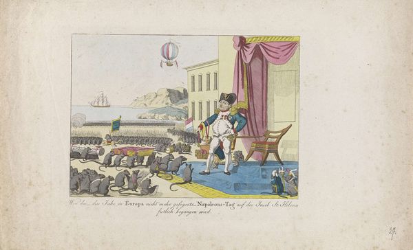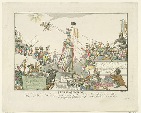 This hand-colored etching, titled *Willem I gooit de jezuïten uit het land*, was made in 1829 by an anonymous artist. The printmaking process used to create this image is interesting in itself. The artist would have first etched the design into a metal plate, likely copper, using acid to bite the lines. Then, ink would be applied to the plate and wiped away, leaving ink only in the etched lines. Finally, the plate would be pressed onto paper, transferring the image. The final touch was the addition of color by hand. We can really consider how the artist's technical skill influences the final product. The sharp lines create a crisp, detailed image, while the hand-coloring adds vibrancy and personality. The very process of etching – a labor-intensive, reproducible medium – speaks to the widespread social and political discontent in the Netherlands at the time. By focusing on the materials, making, and context of this etching, we can gain a deeper understanding of its meaning and significance.