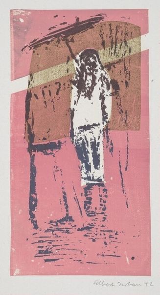 Curator: This untitled print comes to us from Sir Eduardo Paolozzi, part of the Tate collection. Editor: The stark juxtaposition of the soft, pink-toned female figure against the brutal, olive-colored machinery is immediately striking. It's almost jarring. Curator: Paolozzi often explored the impact of technology on society. This print likely reflects the post-war anxiety surrounding automation and its effect on individual identity. Editor: The figure, rendered in such a stylized, almost Warhol-esque manner, feels flattened, dehumanized even, beside the looming mechanical forms. Notice the limited color palette, creating a sense of unease and detachment. Curator: Absolutely, and consider the role of mass media and advertising in shaping perceptions during that era. Paolozzi frequently incorporated such imagery to critique consumer culture. Editor: It's a powerful visual statement about the intersection of humanity and technology, a dance of beauty and the beast, rendered in bold, graphic terms. Curator: A potent commentary on the changing landscape of modern life. Editor: Yes, it makes you question the nature of progress itself.